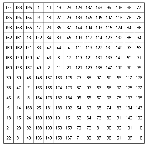 Let's see if we can maybe guess the pattern for a general (4n+2) (4n+2) magic square. 6 = 4*1 + 2, so n = 1 and we changed elements in column one, except for the two diagonal elements. 10 = 4*2 + 2, so n = 2 and we changed element in the first two columns, except for the diagonal elements, and the last column. Since 14 = 4*3 + 2 and n = 3, we might guess that if we change the first three columns, except for the diagonal elements, and the last two rows, we might get a 14 14 magic square. If that works, we might figure the rule is in a (4n+2) (4n+2) square, we would change the first n columns, except for the diagonal elements, and the last n-1 columns. Applying this rule to the 14 14 square we get the following square, which is magic.