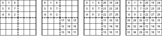 First we partition the 6 6 matrix into four 3 3 blocks. In the upper left-hand block we enter the numbers 1,2,3,...,9 by the Siam method. (See the figure below.) We then enter the numbers 10,11,12,...,18, using the Siam method, in the lower right-hand block. Next we enter the numbers 19,20,21,...,27 in the same way in the upper right-hand block. Finally, we enter the numbers 28,29,30,...,36 in the lower left-hand block, getting the square at right in the figure below.