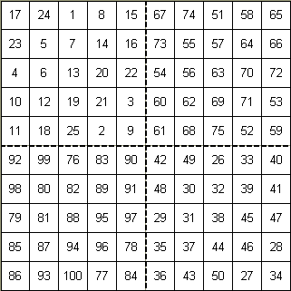 Let's see if we can adapt this method to a 10 10 square. If we partition the square into four 5 5 squares and put the numbers 1,2,...,25 in the upper left-hand square by the Siam method, the numbers 26,27,..,50 in the lower right-hand square, then numbers 51,52,...,75 in the upper right-hand square and, finally, the numbers 76,77,...,100 in the lower left-hand square, then we get the square below.